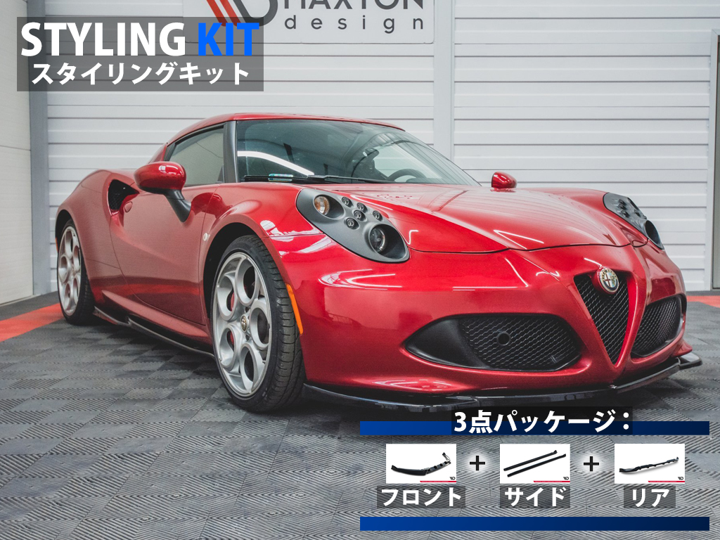 アルファ・ロメオ 4C専用キットにはフロントスプリッター、サイドスカートディフューザー、リアセンタースプリッターのベーシックな3タイプのパーツがラインナップ。当店オリジナルのパッケージ商品「スタイリングキット」もご用意しております。