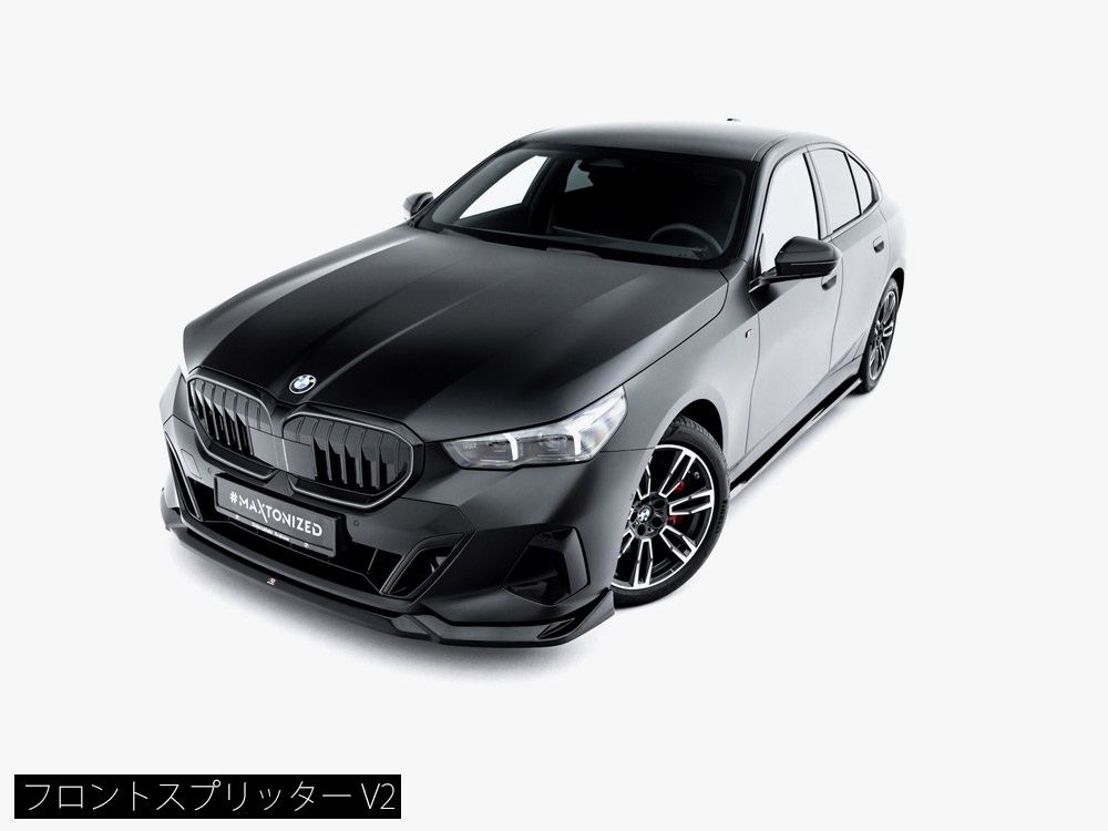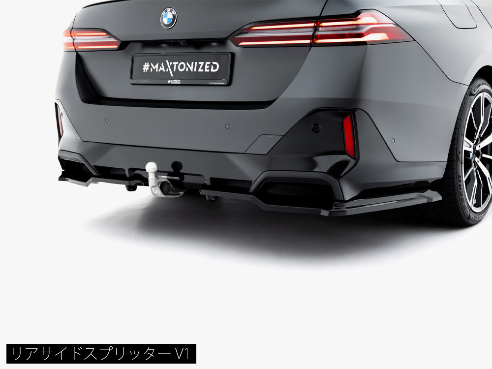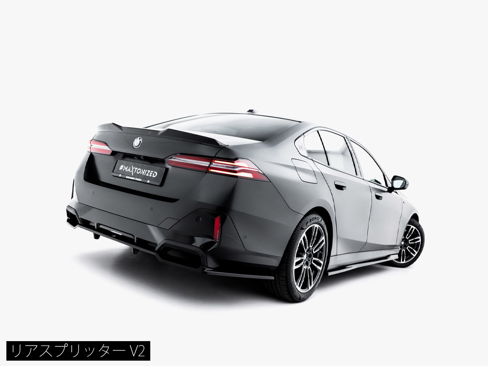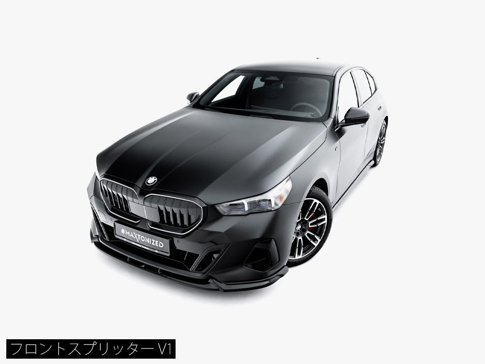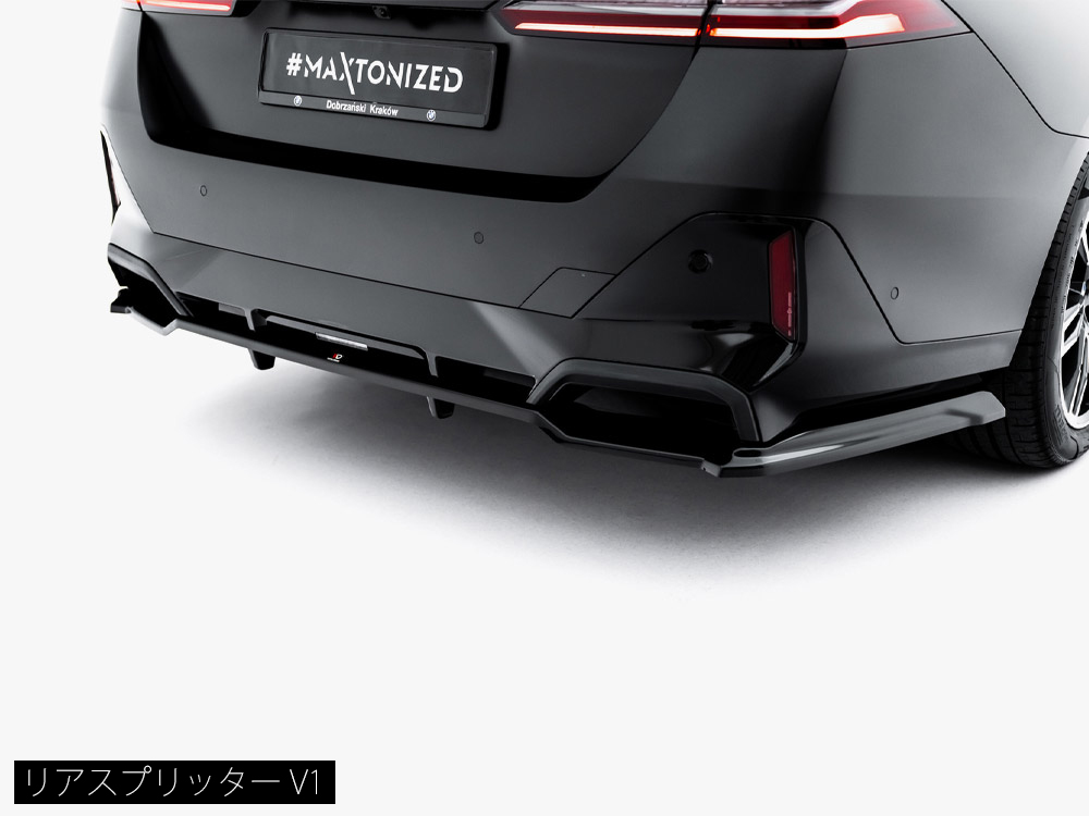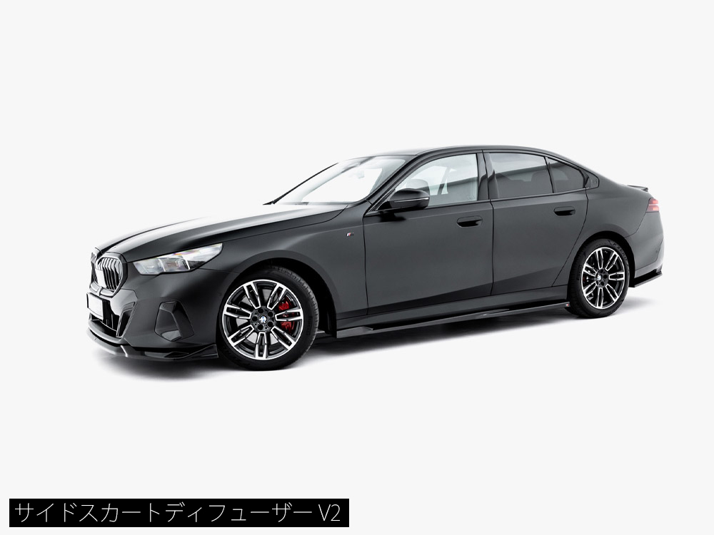 5シリーズ Mスポーツ専用キットにはフロントスプリッター、サイドスカートディフューザー、リアサイドスプリッター、リアスプリッター、スポイラーキャップ、リアウィンドウエクステンションの6タイプのパーツがラインナップ。そのうちフロント/サイド/リアサイド/リアスプリッターの4タイプにおいては各パーツごとに2種類のデザインが設定され、お好きなデザインをお選びいただけます。