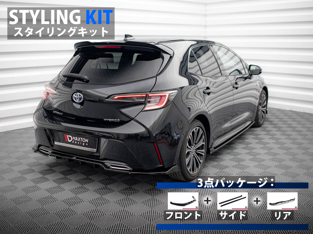 トヨタ カローラスポーツ (210系/前期型)専用キットにはフロントスプリッター、サイドスカートディフューザー、リアスプリッター、スポイラーキャップの4タイプのパーツがラインナップ。当店オリジナルのパッケージ商品「スタイリングキット」もご用意しております。