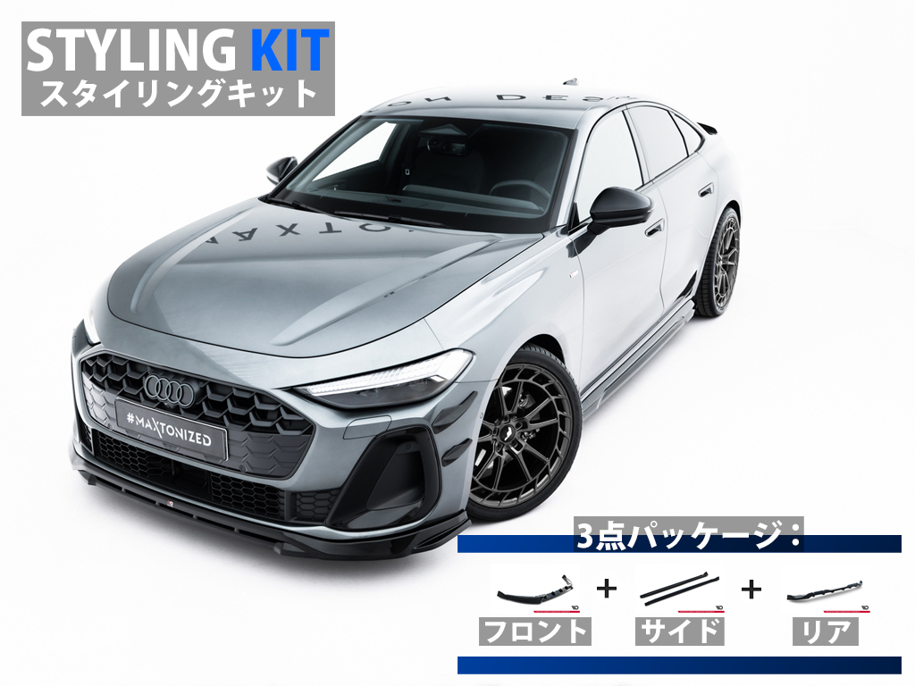 A5 セダン/アバント専用キットにはフロントスプリッター、サイドスカートディフューザー、リアスプリッターの3タイプのパーツがラインナップ。フロント用は2種類のデザインが設定されておりますので、お好きなデザインをお選びいただけます。