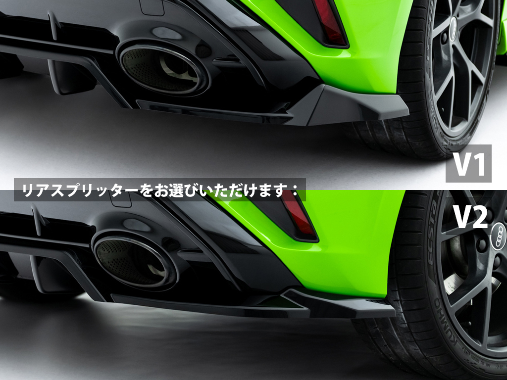 アウディ RS3 スポーツバック専用キットにはフロントスプリッター、サイドスカートディフューザー、リアスプリッター、スポイラーキャップの4タイプのパーツをラインナップ。フロント/サイド/リアの3タイプのパーツには複数のデザインが設定され、組み合わせ自由にスタイリングを決めることができます。