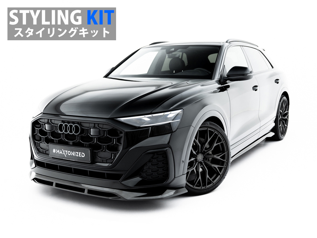 アウディ Q8 Sライン向けにはフロントスプリッター、サイドスカート、リアサイドスプリッター、テールゲートスポイラーの4タイプのパーツがラインナップ。当店のオリジナルのパッケージ商品「スタイリングキット」も合わせて設定しております。