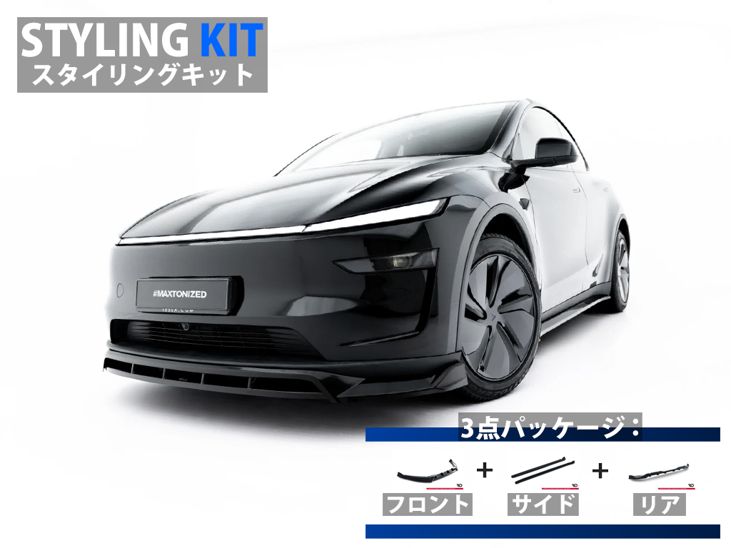 フェイスリフト版のテスラ モデルY専用キットにはフロントスプリッター、サイドスカートディフューザー、リアスプリッター、スポイラーキャップの4タイプのパーツがラインナップ。また当店オリジナルのパッケージ商品「スタイリングキット」もご用意しております。
