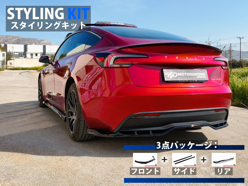 テスラ モデル3専用キットにはフロントスプリッター、サイドスカートエクステンション、リアスプリッター、トランクリップスポイラーの4タイプのパーツがラインナップ。当店オリジナルのパッケージ商品「スタイリングキット」もご用意しております。