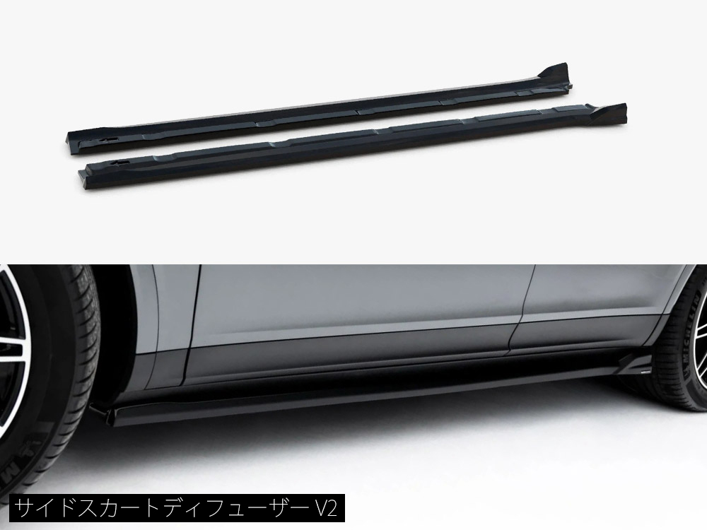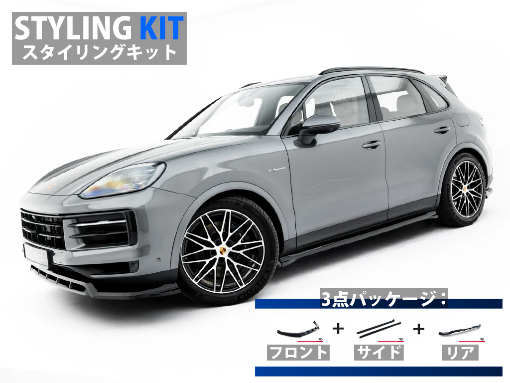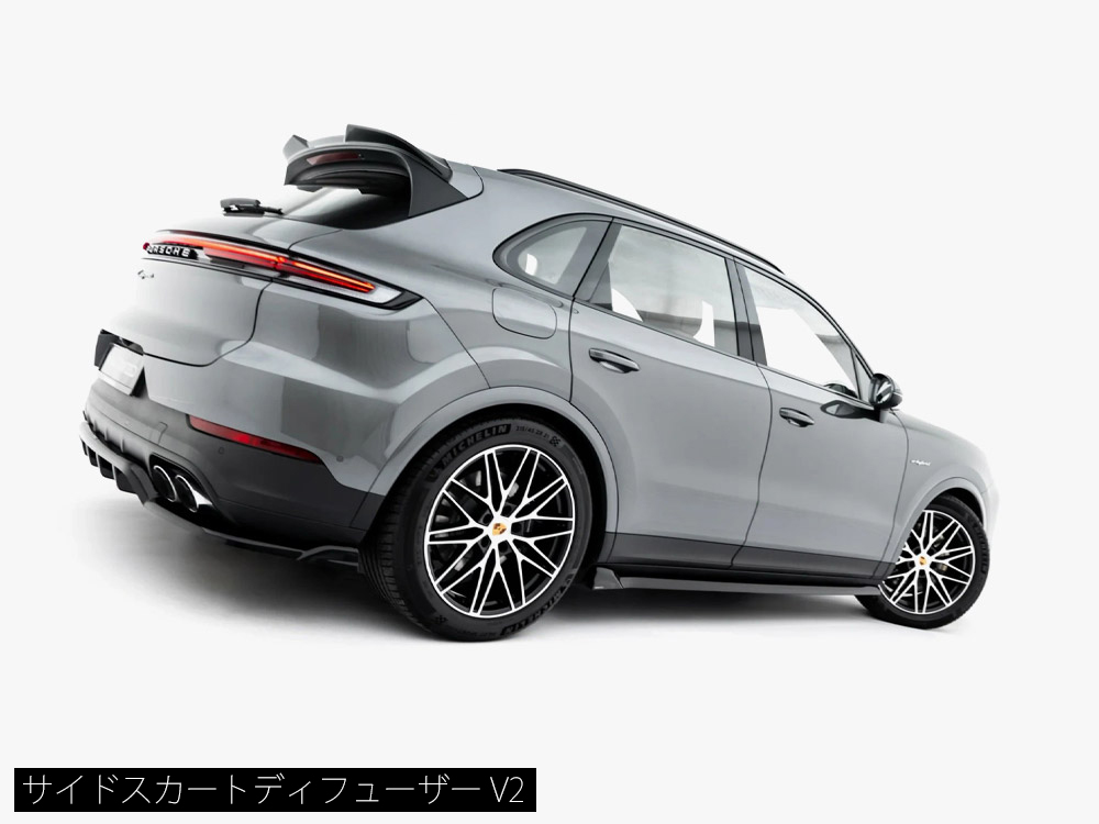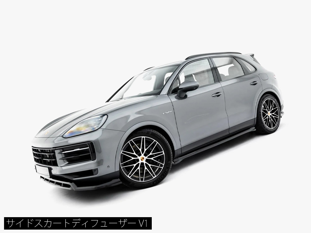 ポルシェ カイエン (E3.2/後期型)専用キットにはフロントスプリッター、サイドスカートディフューザー、リアスプリッター、スポイラーキャップの4タイプのパーツがラインナップ。サイド用のパーツは2種類のデザインが設定され、お好きなデザインをお選びいただけます。